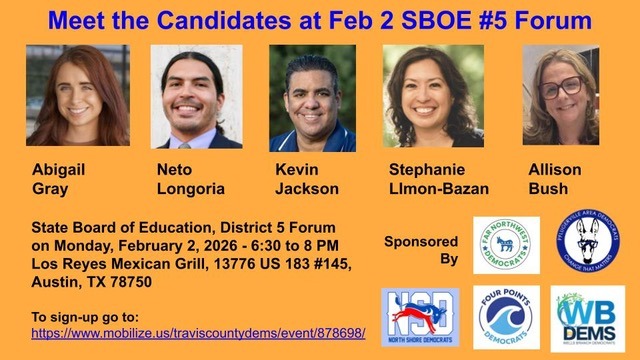 Which of these five candidates should replace the current rep for SBOE District 5? Come hear from them and help decide in the March Primary election.